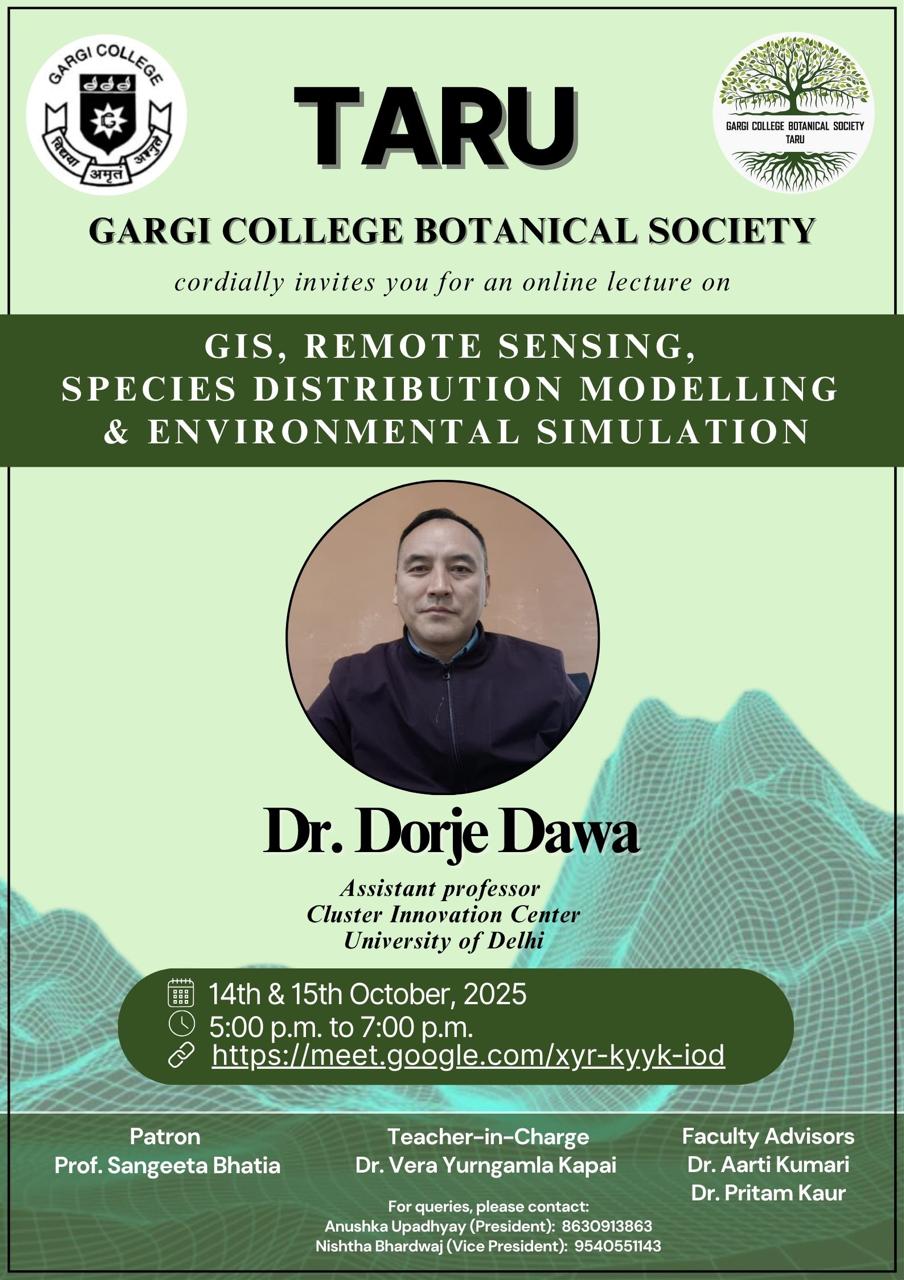 The Gargi College Botanical Society, TARU, marked the commencement of its session with a splendid inaugural ceremony on the 26th of September in the year 2023. Ms. Seema Charla, an esteemed authority in the realm of Science of Spirituality, graced the occasion as the distinguished guest speaker. She eloquently elucidated to the assembled students the profound path to academic excellence, elucidating how the practice of meditation can serve as an invaluable tool in their scholastic endeavors. After this encouraging lecture, Ms. Seema Charla and the faculty advisors distributed badges to the office bearers of the society. The program seamlessly transitioned into a practical demonstration of environmental stewardship as a tree plantation ceremony unfolded. Saplings were meticulously distributed among the attendees, symbolizing the society's commitment to fostering sustainable ecosystems and nurturing the growth of knowledge and greenery alike.