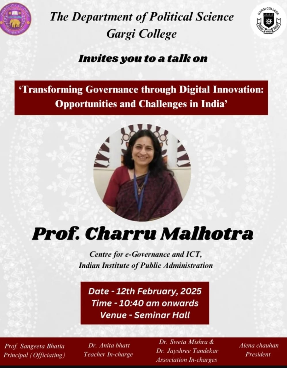Keeping pace with digital advancements, a Speaker session on “Transforming Governance Through Digital Innovation” was held on February 12, 2025, featuring Prof. Charru Malhotra from IIPA as the distinguished speaker.